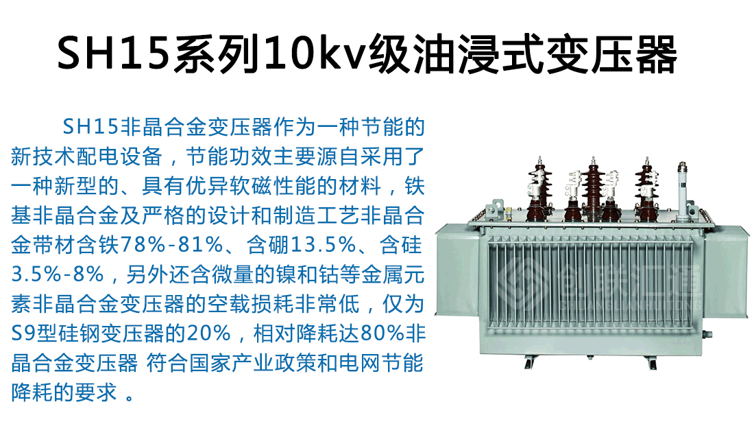 SH15非晶合金變壓器作為一種新一代節能產品,可以普遍適用于住宅小區、學校、工礦企事業單位以及社會公共設施。可在戶內(外)使用,容量在315kVA 及以下時可安裝在桿上,海拔高度不超過1000m。